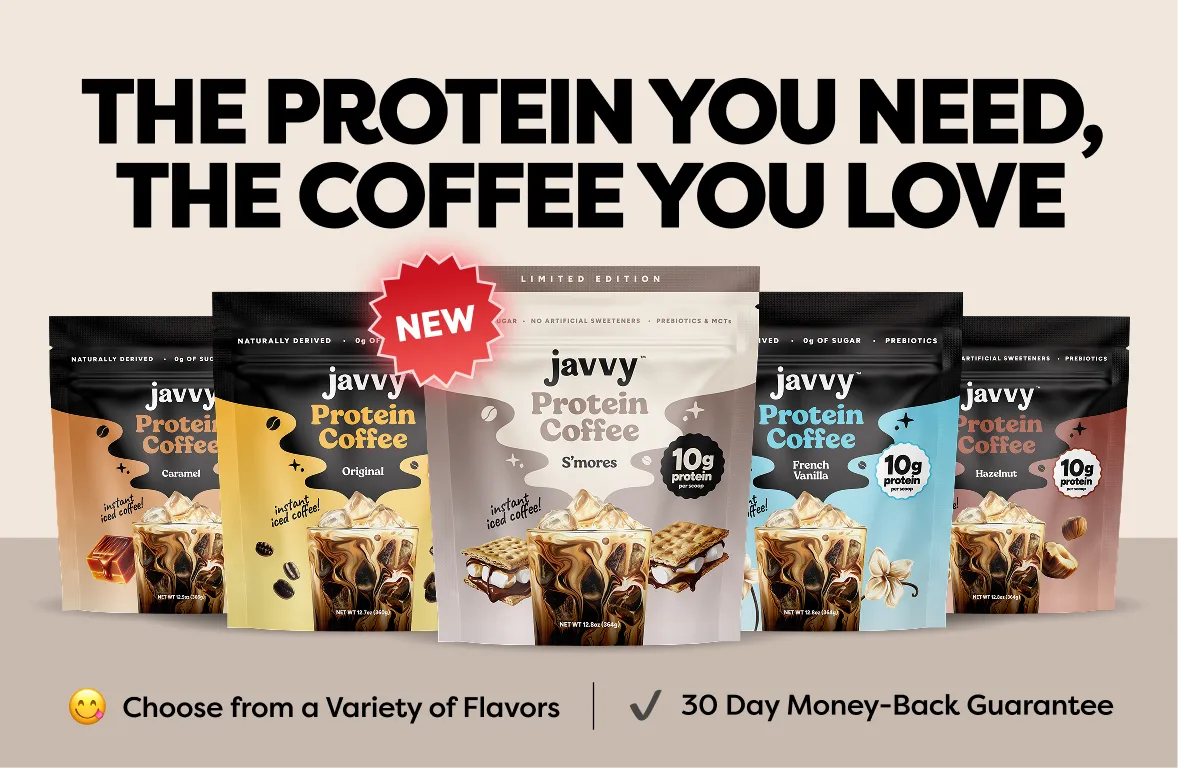 Buttery vanilla and chocolate chip–flavored coffee with premium whey protein